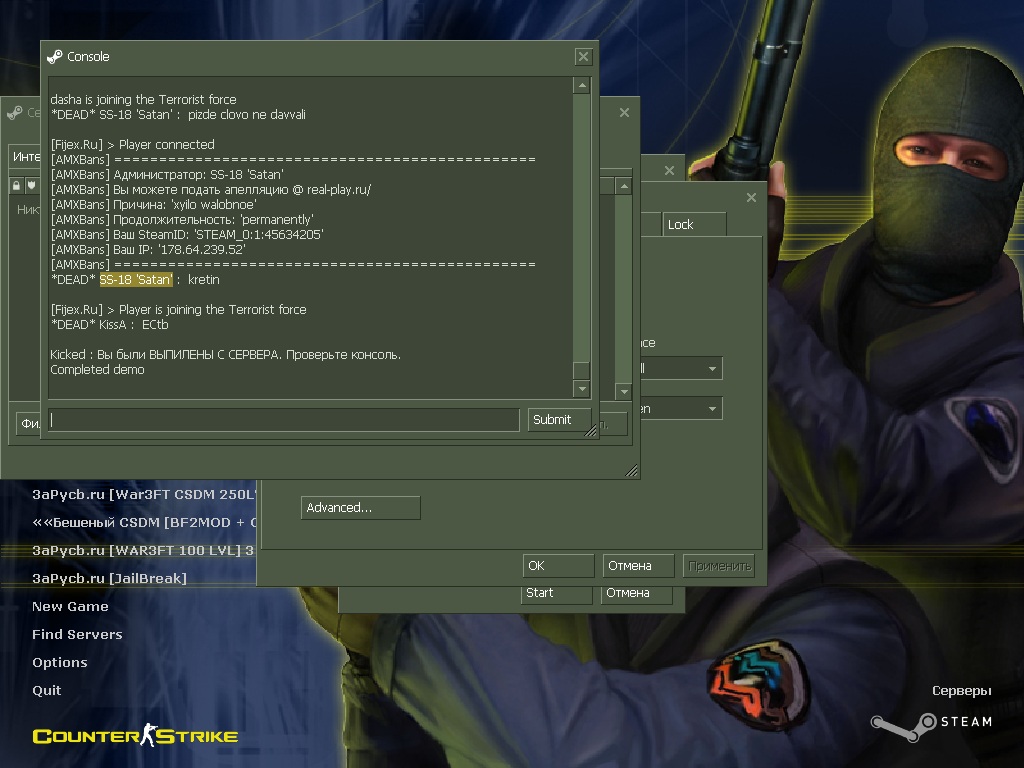 1. 1. SS-18 'Satan' 2. Паблик Морозов 3. 17:50-18:00 11.01.13 4.демо на мыло 5. DISMAY! 6. зашел на сервер пробыл секунд 10 администратор неадекват когда зашел оскорблял игрока сделал ему замечание и посмотрите что получил:-) мне кажется что он заслуживает больше такого наказания чем я не правда-ли?:-)